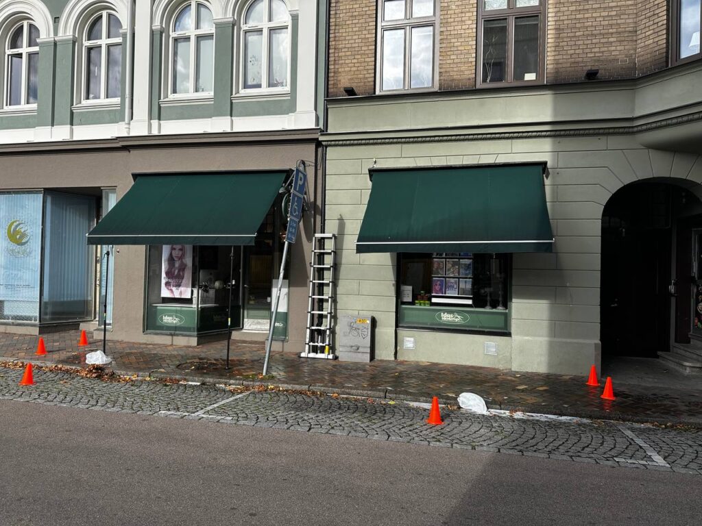 Uppdraget gällde två gröna markiser som täcker salongens skyltfönster. Läget är typiskt för en stadskärna med stenlagd trottoar, nära körbana och med träd i närheten. Smutstypen var en kombination av trafikfilm, damm, pollenrester och en del punktfläckar. För att inte störa salongens verksamhet lade vi upp arbetet i ett sammanhållet pass under förmiddagen. Vi avspärrade med koner, informerade personalen om när sköljvatten kunde rinna över trottoaren och skyddade fasaddetaljer där vi såg risk för stänk.